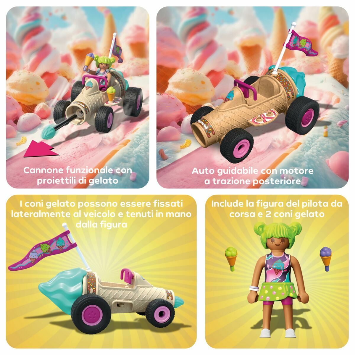 Playmobil playset "Playmobil Racing jäätisekoonus" on mängukomplekt, mis on mõeldud spetsiaalselt lastele alates 3. eluaastast, kuid sobib ka üle 4-aastastele. Valmistatud vastupidavast plastikust ja mitmevärvilisena, pakub see mängukomplekt turvalist ja kaasahaaravat mängukogemust, mis soodustab loovust ja lapse kujutlusvõimet. Selle värvikas disain köidab väikeste laste tähelepanu ning soodustab sümboolset mängu võidusõidu ja jäätise teemal, mis aitab arendada motoorseid ja sotsiaalseid oskusi. Oluline on arvestada, et komplekt sisaldab väikeseid osi, mistõttu sobib see ainult üle 36 kuu vanustele lastele lämbumisohtu tõttu. Valmistatud Hiinas, vastab see komplekt laste mänguasjade ohutusnõuetele, tagades usaldusväärse ja sobiva kasutuseesmärgi. See playset ühendab lõbu, kvaliteedi ja ohutuse, kutsudes looma dünaamilisi ja meelelahutuslikke mängustseene ning on soovitatav valik eelkooliealistele lastele.