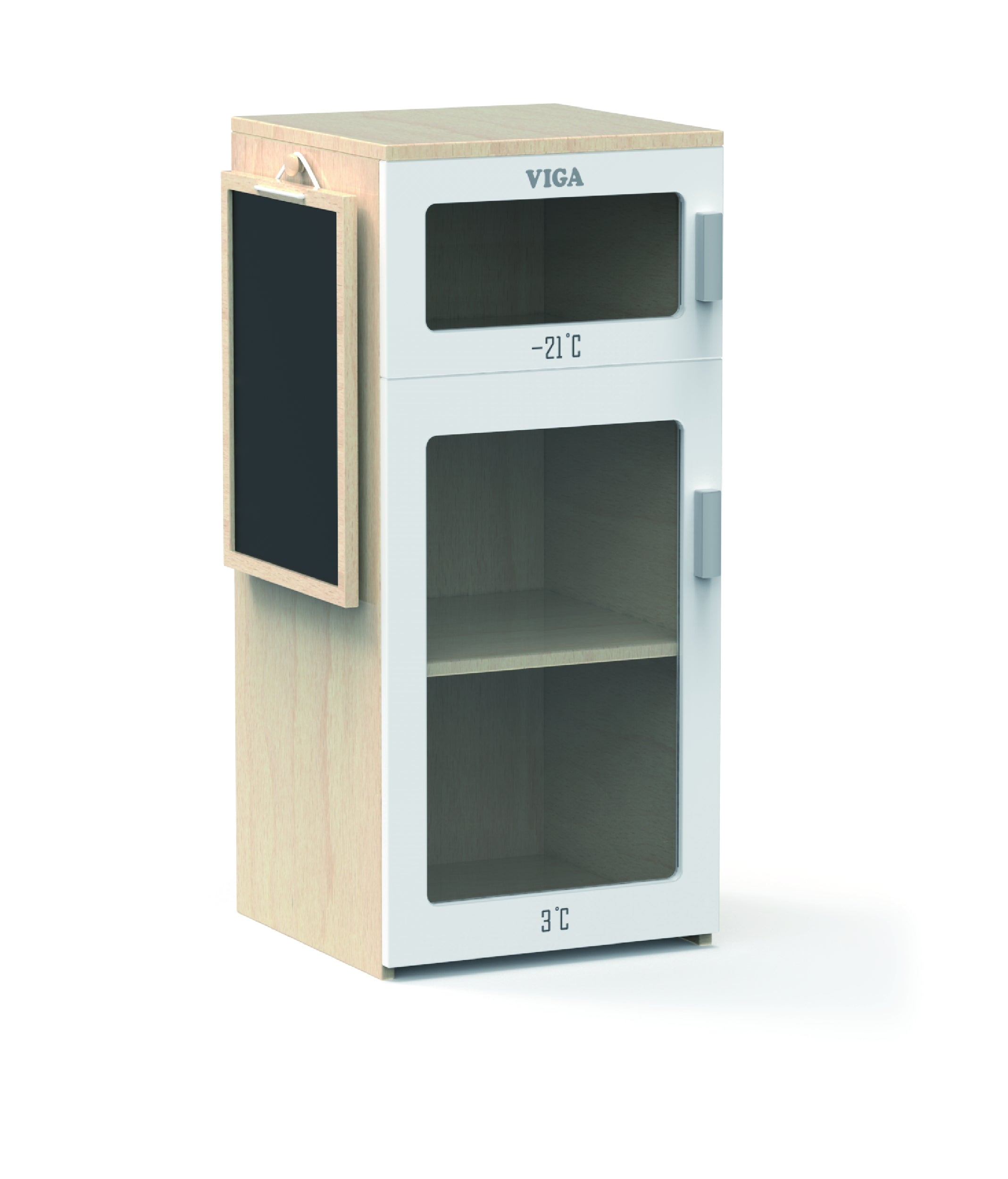 Täienda oma lapse mängunurka armsa Viga puidust külmikuga. See realistlik mänguasi on suurepärane viis kreatiivsuse ja kujutlusvõime arendamiseks mängides kodu. Külmikul on kaks osa - külmik ja sügavkülmik, mille kaudu laps saab kujutada, et hoiab oma tooteid õigetes temperatuurides. Lisaks on külmiku uksele paigaldatud kriiditahvel, kuhu pisike saab kirjutada ostunimekirja või joonistada.