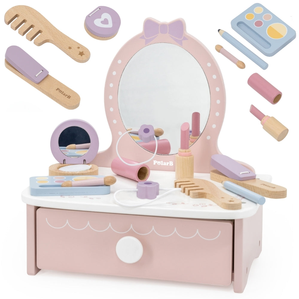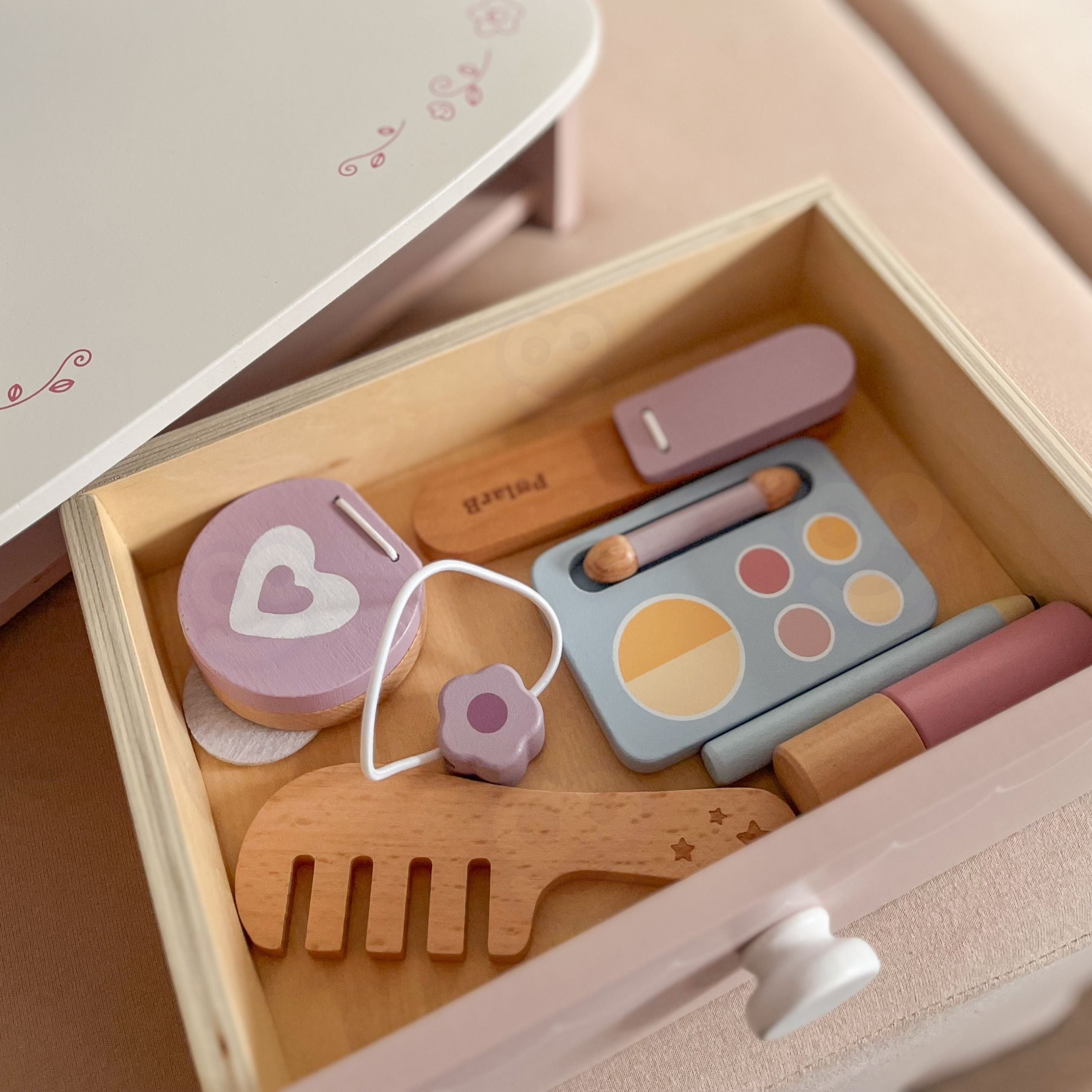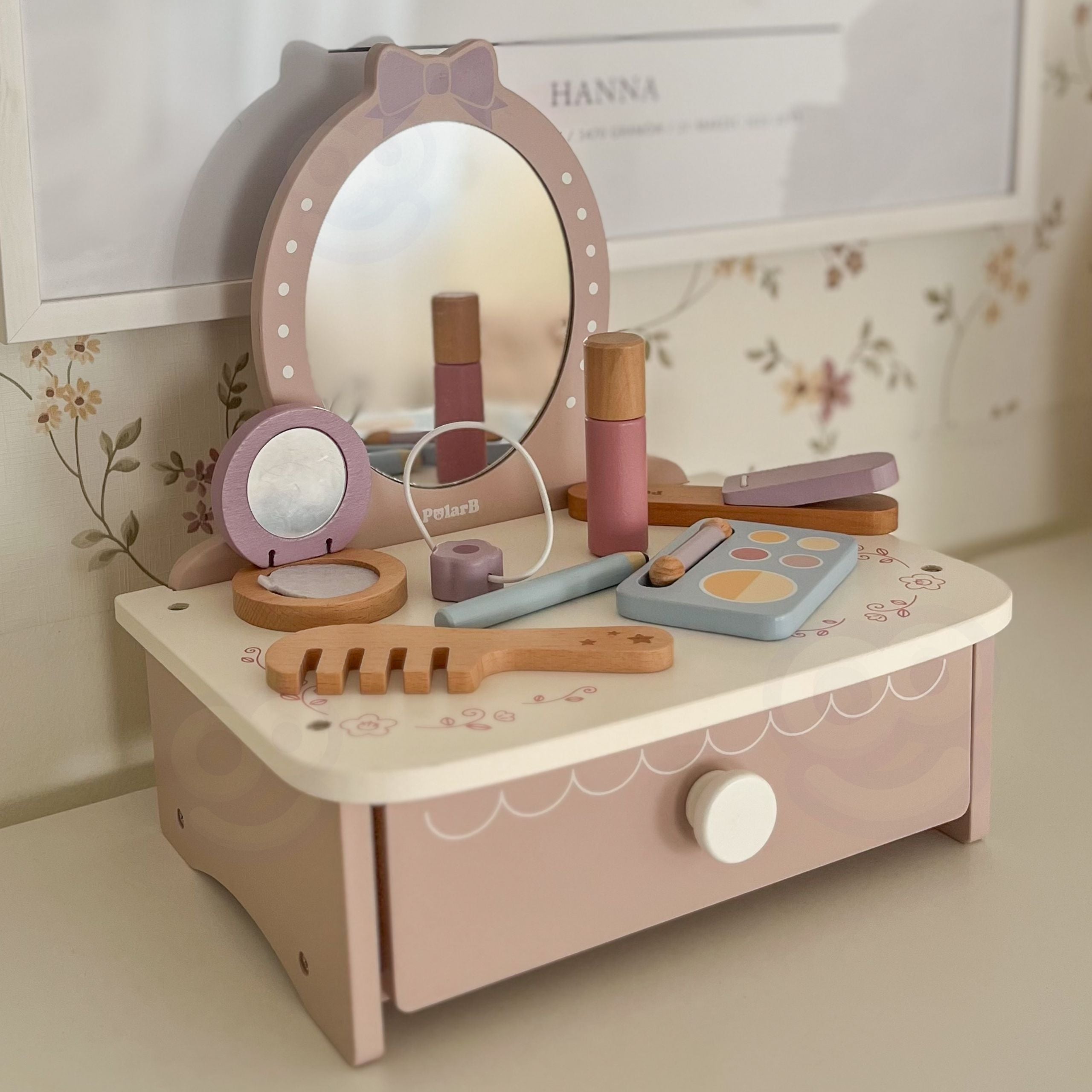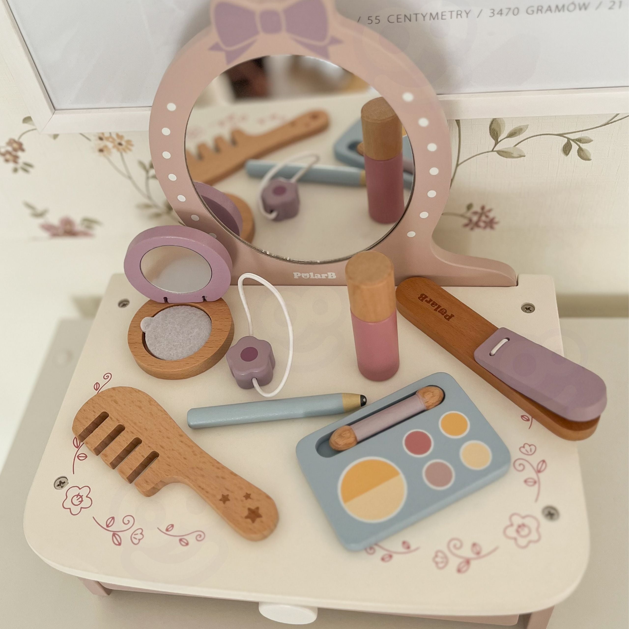 Kaunis, Viga brändi puidust meigilaud on ideaalne mänguasjade komplekt iga tüdruku jaoks, kes armastab riietuda, kodumängu või ilusalongi mängida. Kujundatud pastellvärvides, koos ohutu peegliga ja paljude armsate lisadega, toob see rõõmu ja hoiab last tundide viisi tegevuses. See armas puidust meigilaud pole ainult mänguasi – see on värav fantaasia ja loova mängu maailma!