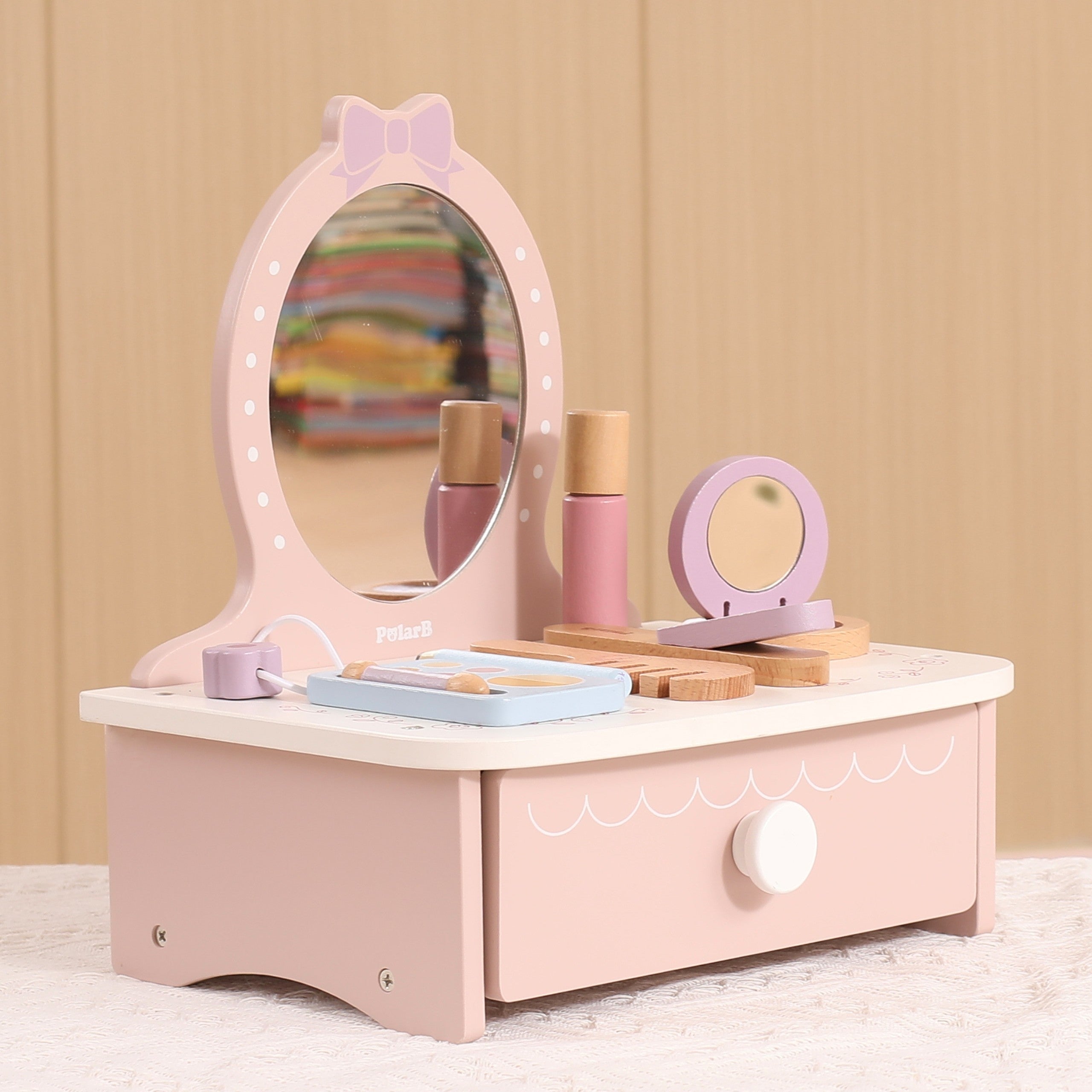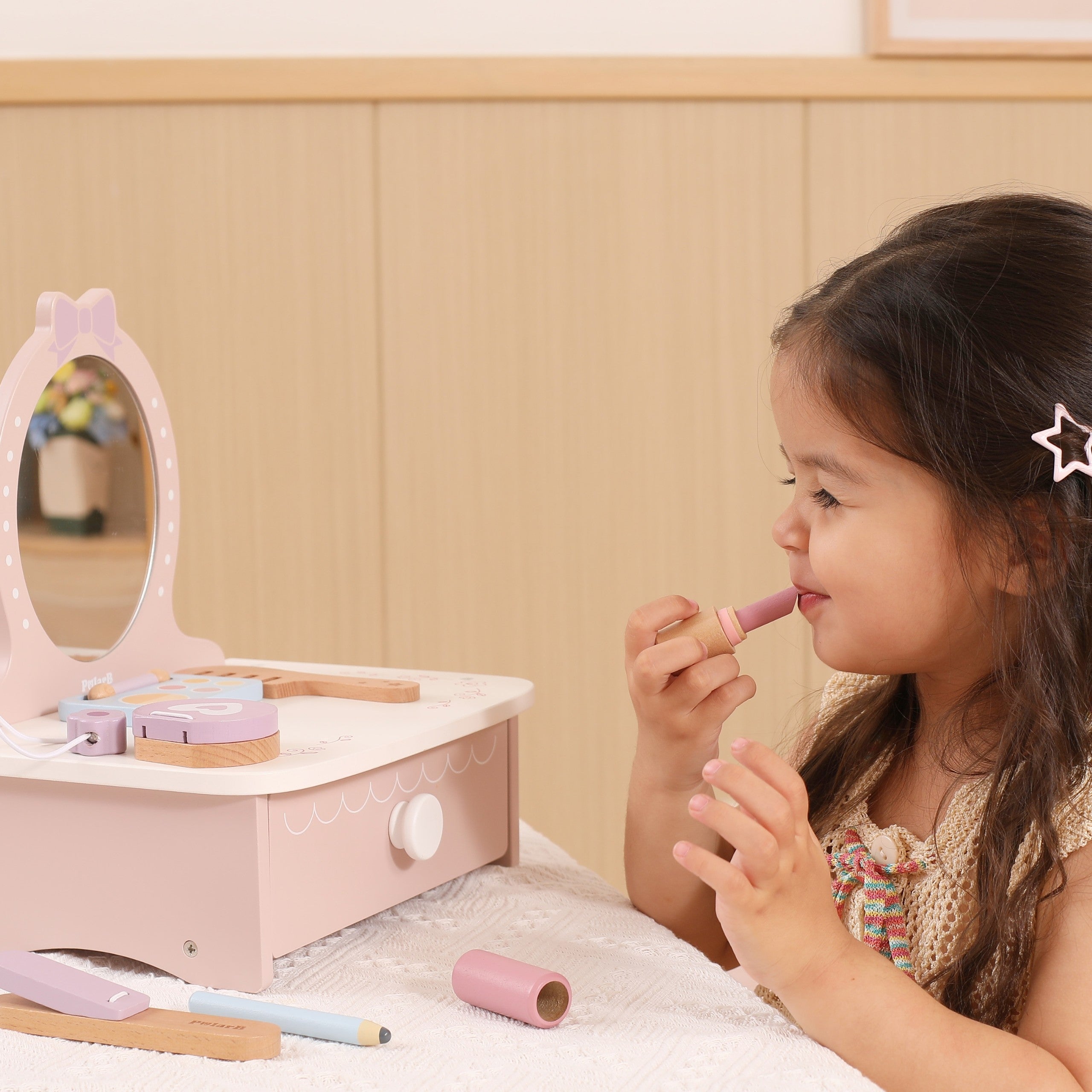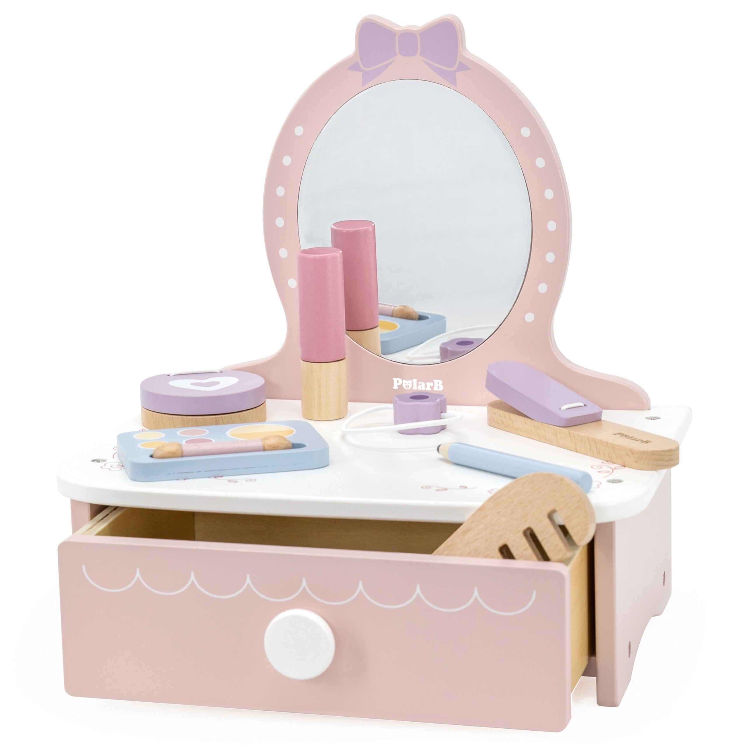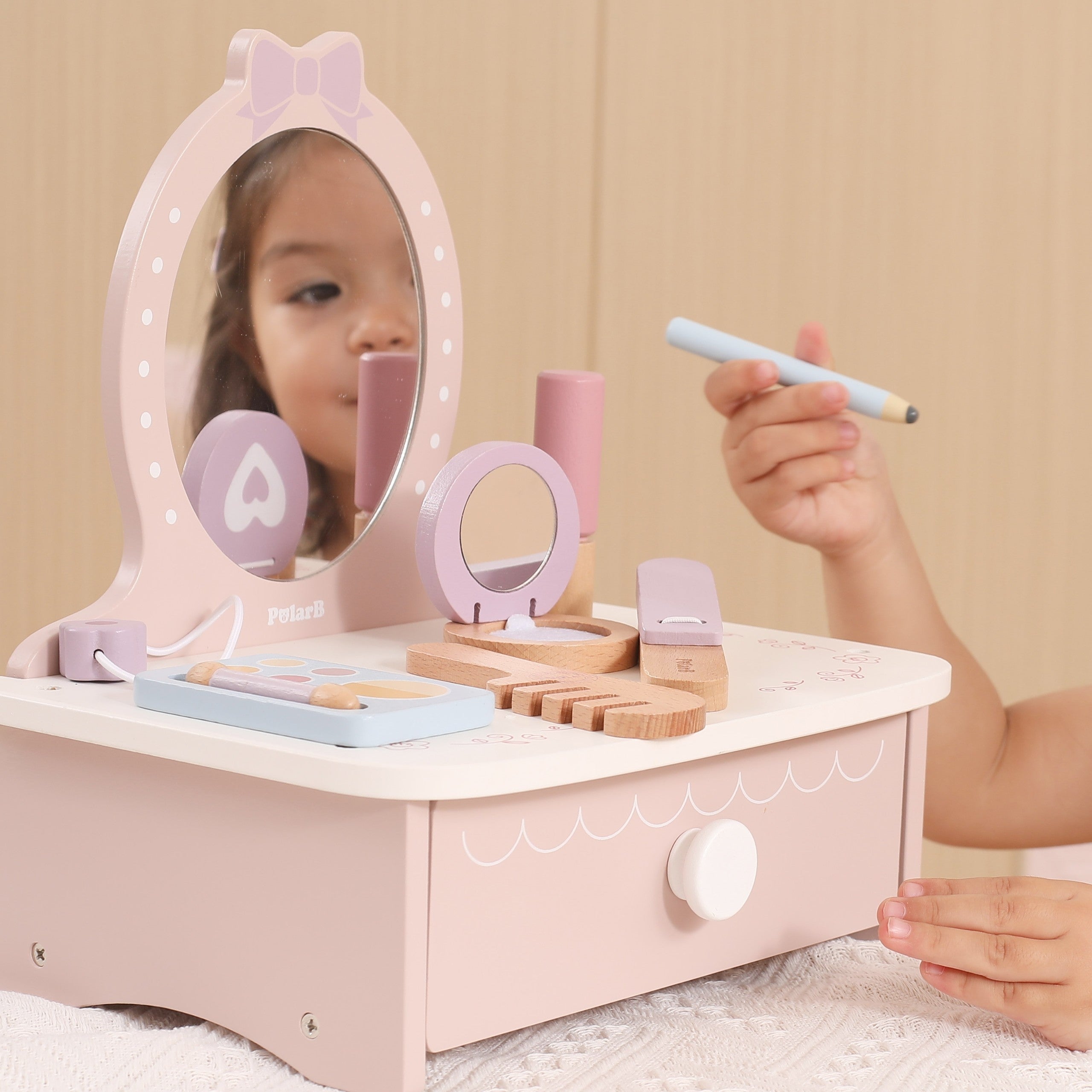 Kaunis, Viga brändi puidust meigilaud on ideaalne mänguasjade komplekt iga tüdruku jaoks, kes armastab riietuda, kodumängu või ilusalongi mängida. Kujundatud pastellvärvides, koos ohutu peegliga ja paljude armsate lisadega, toob see rõõmu ja hoiab last tundide viisi tegevuses. See armas puidust meigilaud pole ainult mänguasi – see on värav fantaasia ja loova mängu maailma!