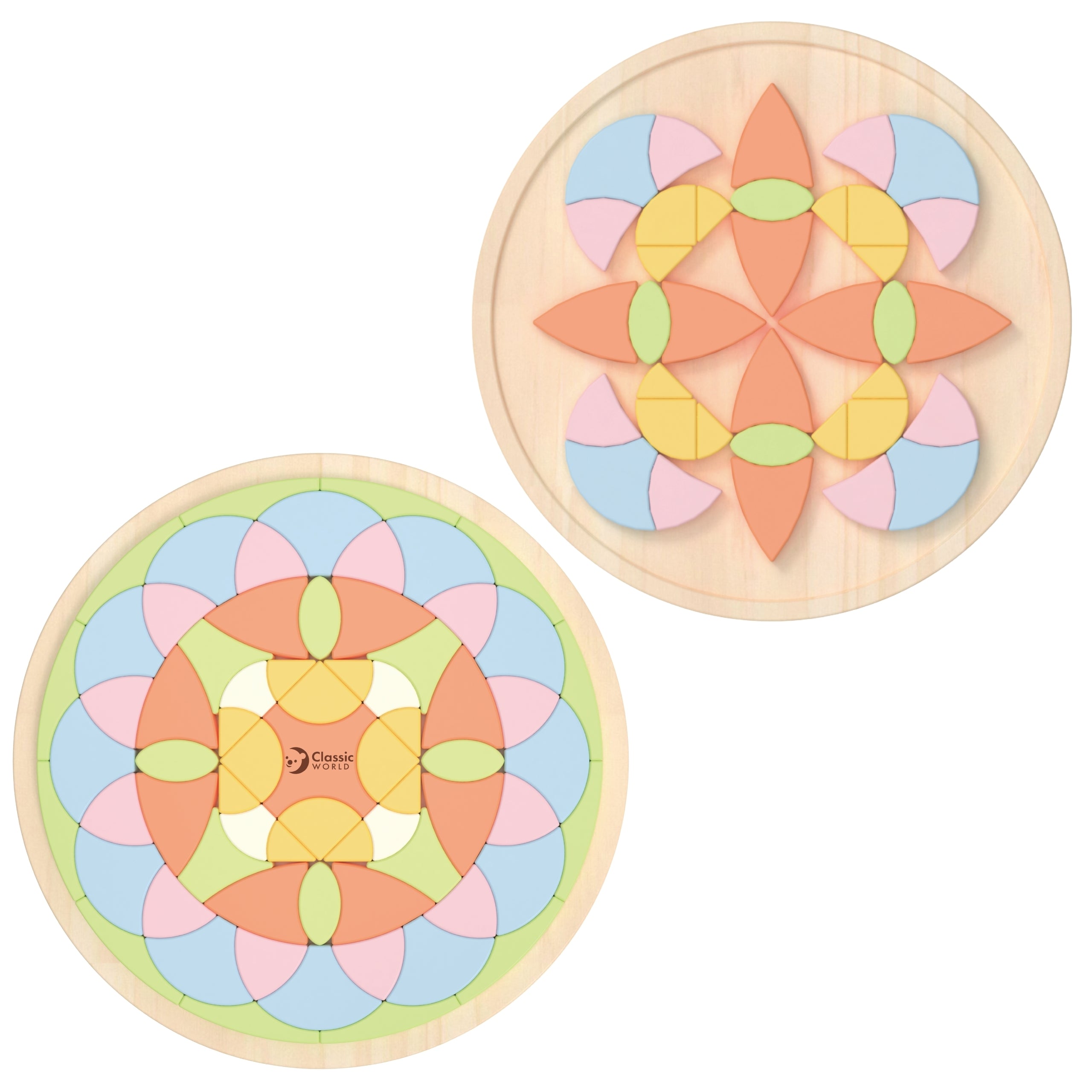 Puit värvilised Mandala puidust blokkide komplekt Classic World'ilt on loominguline pusle, mis on inspireeritud õitsevate lillede motiivist. Värvilised elemendid täpsete nurkade ja harmooniliselt valitud värvidega võimaldavad lastel vabalt luua kauneid, sümmeetrilisi mustreid, mis meenutavad mandalat. Iga plokk on disainitud nii, et see võimaldab neid asetada nii vastavalt mustrile kui ka oma fantaasiale. Pusle sobib suurepäraselt iseseisvaks mängimiseks, aga ka koos eakaaslaste või täiskasvanutega loomisel.