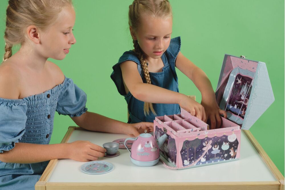 Karbist leiate: fantastilise muusikalise teekannu, 1 kandiku, 2 lusikat, 2 tassi, 2 alustassi ja 2 taldrikut.