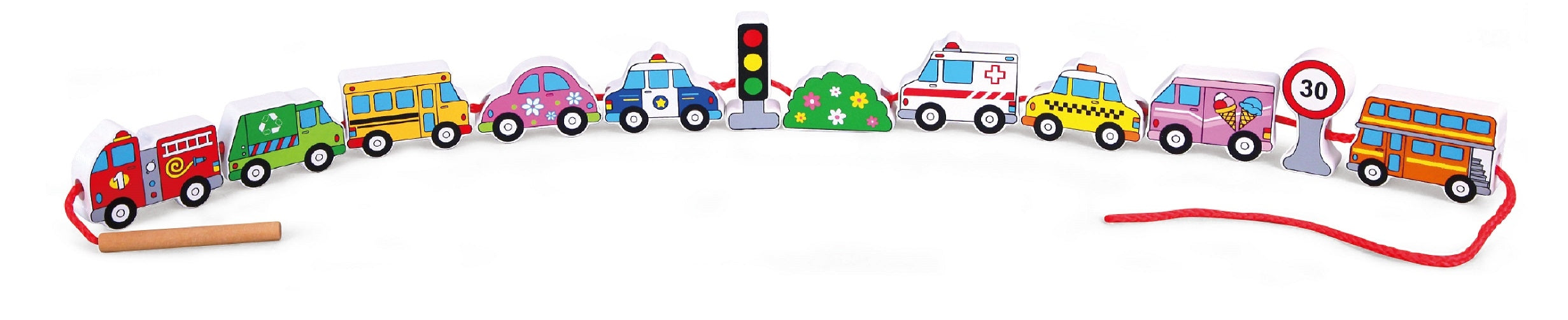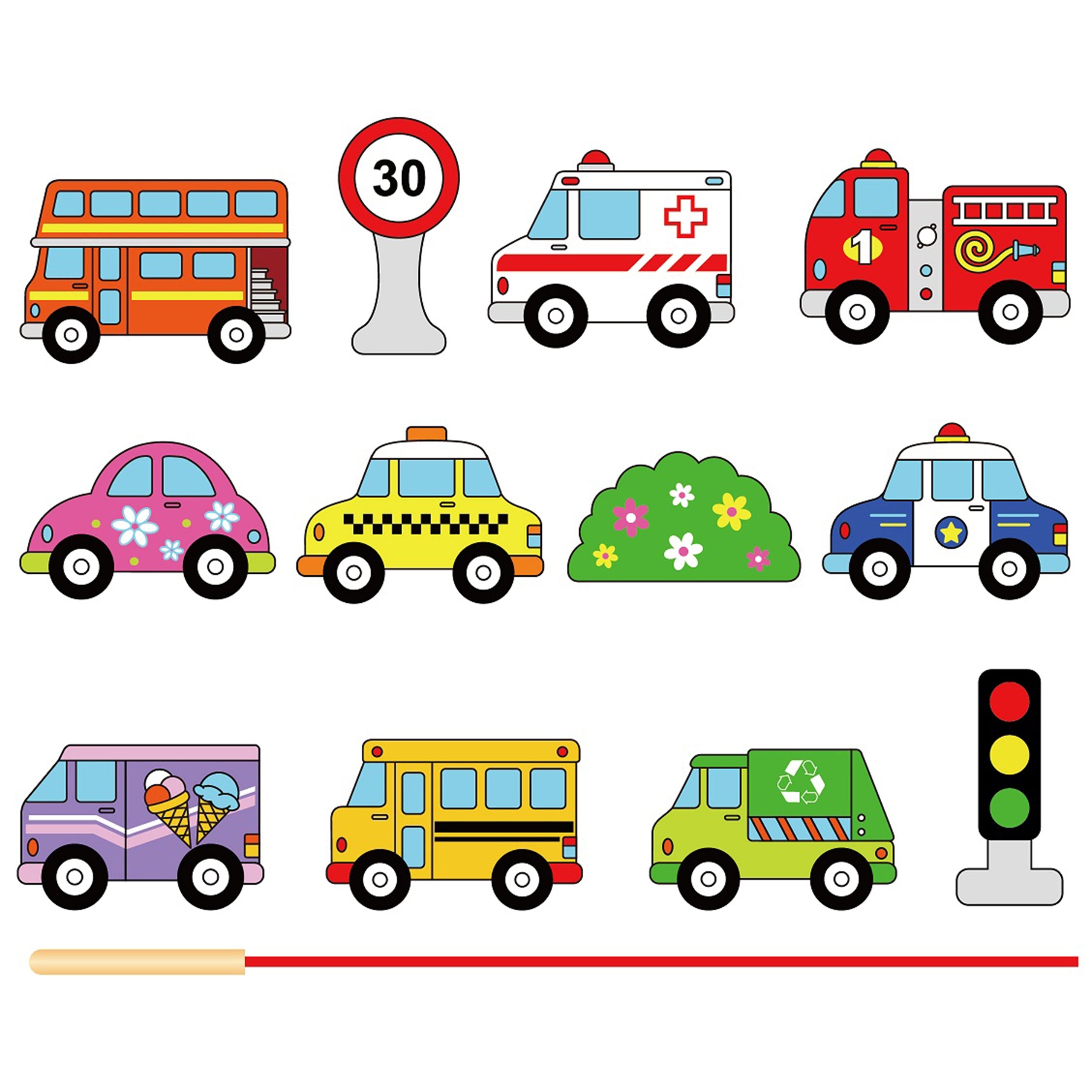 • 12 värvilist puidutükki erinevate sõidukite kujudes: autod, bussid ja kaubikud
